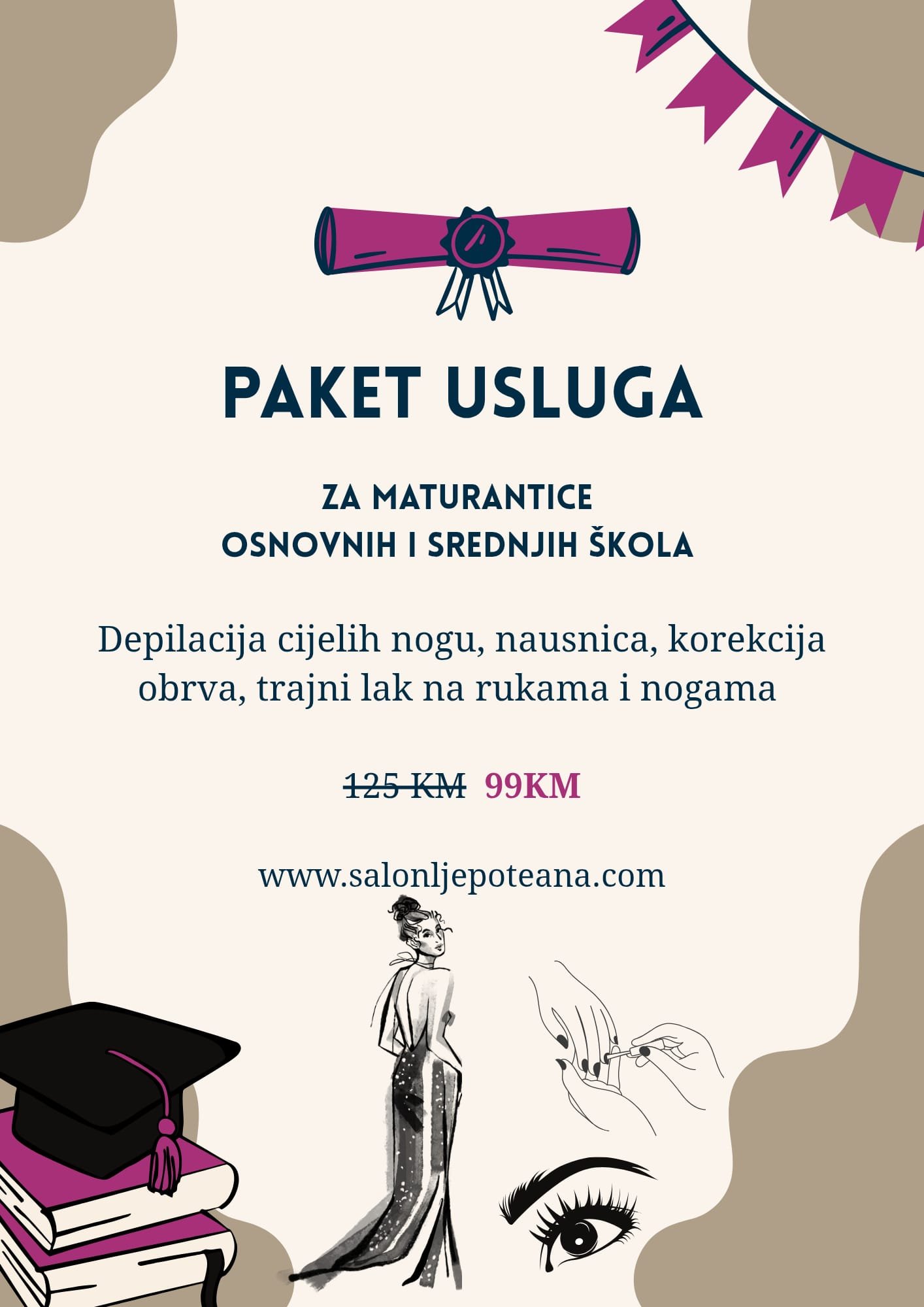 Paket usluga se može iskoristiti od datuma kupovine do 31.12.2026. i isključivo u JEDNOM terminu. Može biti idealan poklon za maturanticu ili poklon za samu sebe.